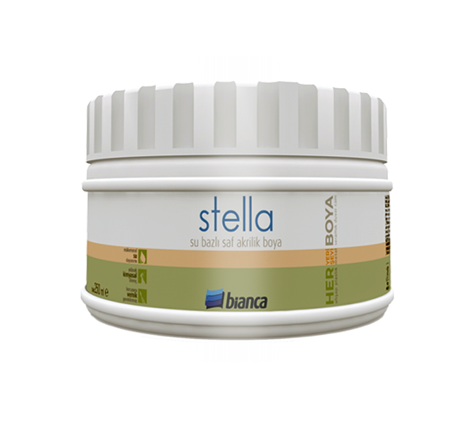 Uygulama öncesi hazırlık: Uygulama yapılacak yüzeyin mutlaka temiz olması gereklidir. Yüzey, tüm toz, kir, yağ gibi boyanın yüzeye tutunmasını azaltacak tüm etmenlerden arındırılmış olmalıdır. Gerekli ön hazırlığı yapılmış yüzeye Stella Su Bazlı Saf Akrilik Boya inceltilmeden 2 kat halinde, ipek fırça, ipek rulo, moher rulo veya püskürtme ile uygulanır. Katlar arasında min. 2 saat beklenmelidir.